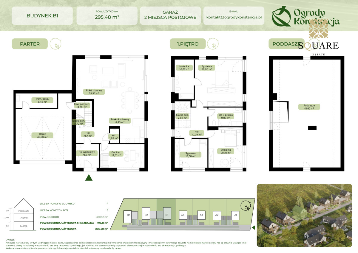 Budynek B1 to łącznie 295,48 m² oraz 370,52 m² działki.