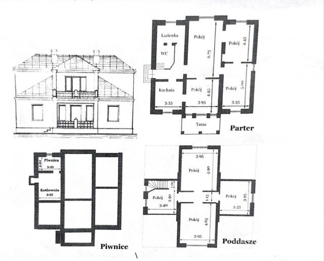 Willa o powierzchni mieszkalnej ok.180m2, z czego 100m2 na parterze oraz ok. 80 m2 na piętrze. Dodatkowo nieużytkowy strych. Częściowe podpiwniczenie. Dom murowany, dach kryty blachą.
