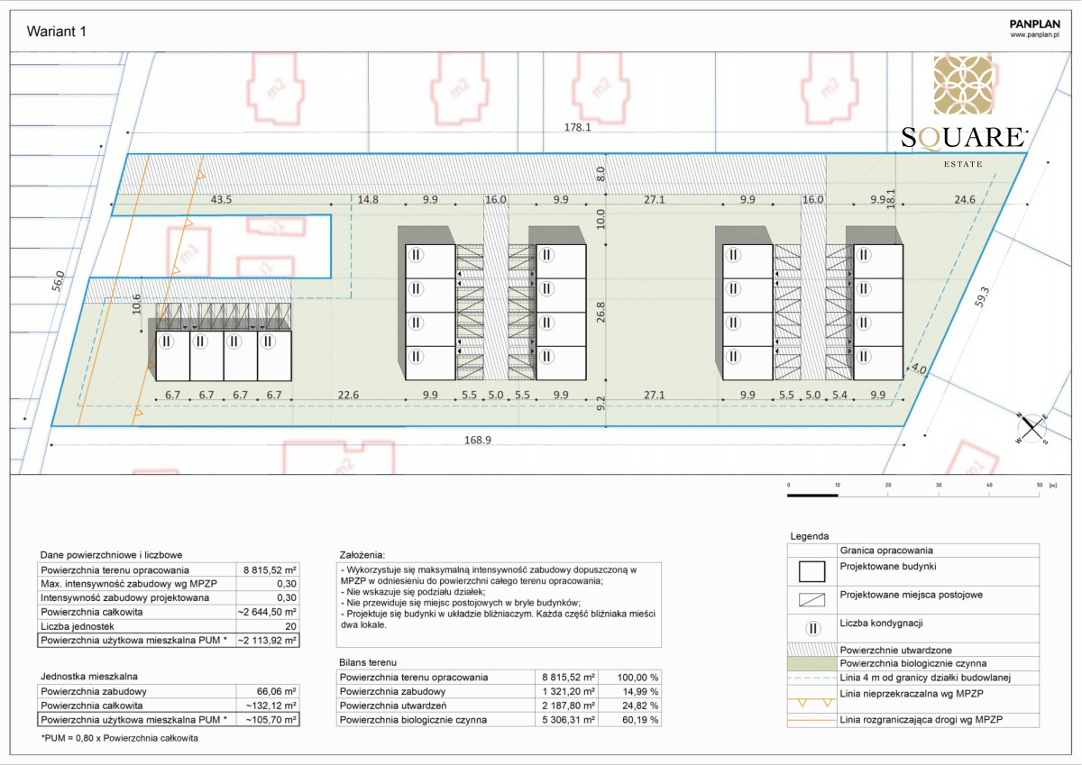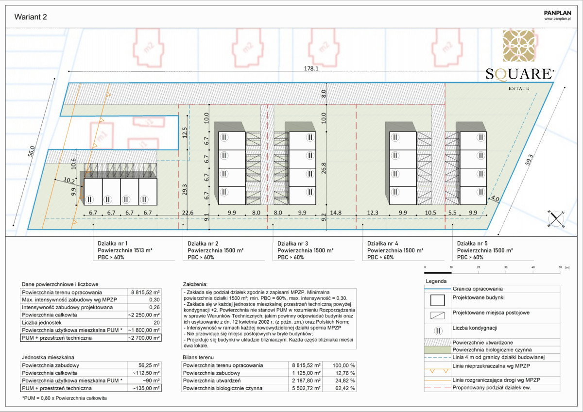 Na podstawie wstępnej analizy chłonności wykonanej przez architekta na działkach można wybudować 10 bliźniaków, czyli 20 lokali mieszkalnych po około 130m2 z poddaszem nieużytkowym.