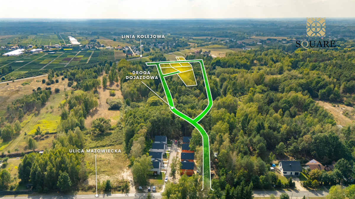 Działki z dostępem do drogi publicznej od ul. Mazowieckiej - oddalone od niej ok. 300m - gwarancja ciszy dla przyszłych mieszkańców. Droga wewnętrzną na planie na zielono,