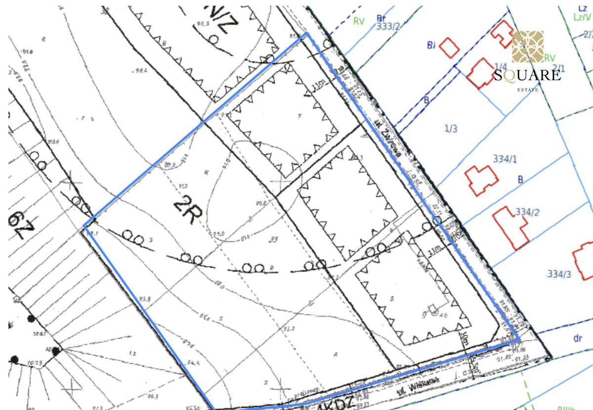 Możliwość wybudowania min. 3 budynków w zabudowie bliźniaczej ( 6 lokali), wraz z bardzo dużą i malowniczą częścią „ zieloną” skarpy do użytku właścicieli każdej nieruchomości.
