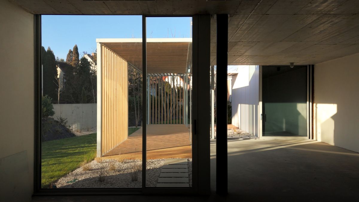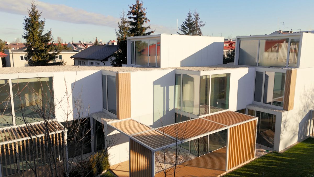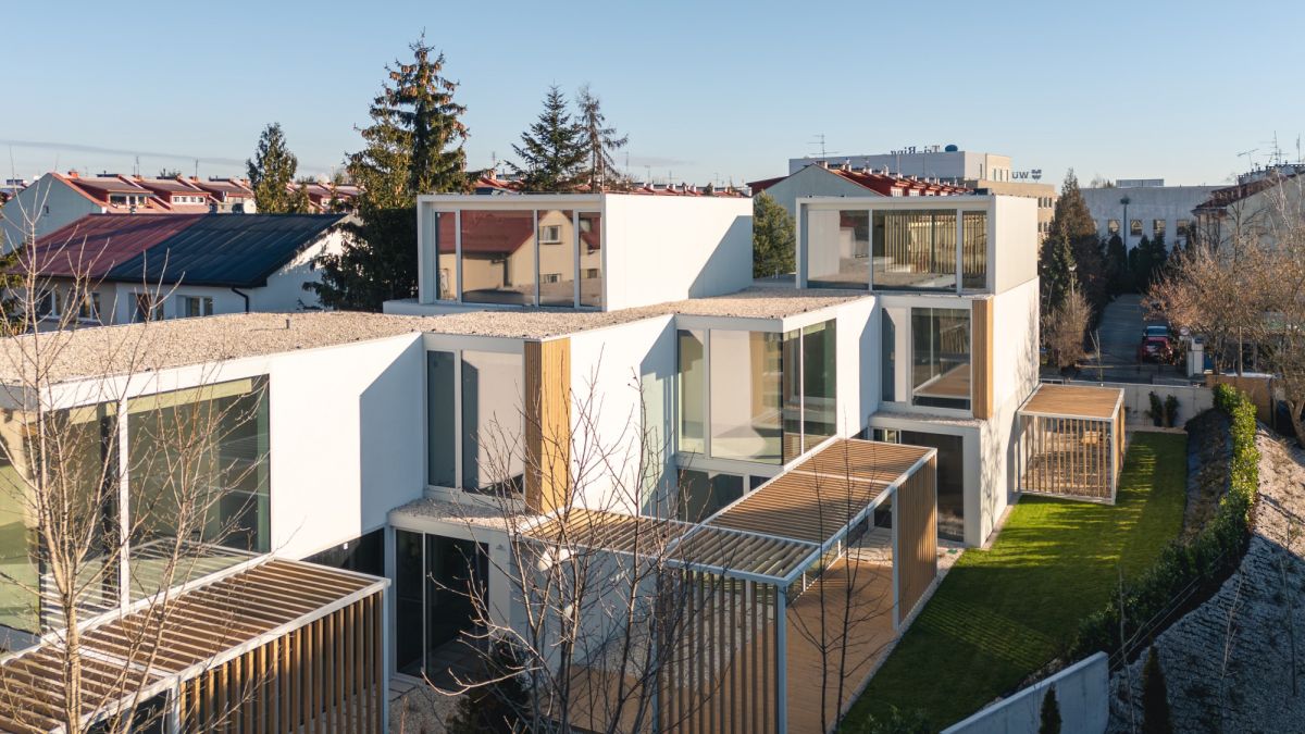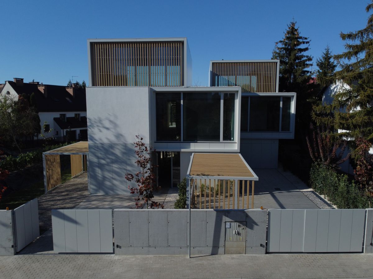 Architektura współczesna, modernistyczna, oszczędna w prostocie form. Niestandardowe rozwiązania architektoniczne gwarantujące intymność i prywatność. Przeszklone ściany domu, zieleń wchodząca do wnętrz. Bryły wzajemnie przeplatających się budynków.