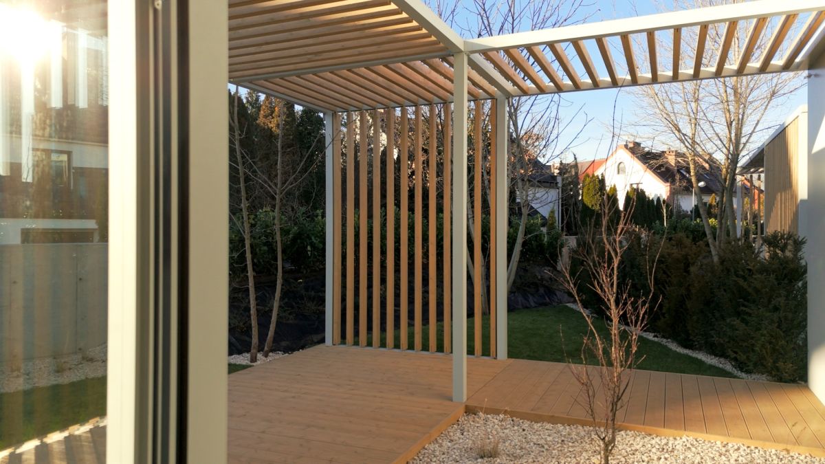 Ogródki zaaranżowane zostały ażurowymi formami lekkich pergoli drewnianych przesłaniających strefy prywatne.