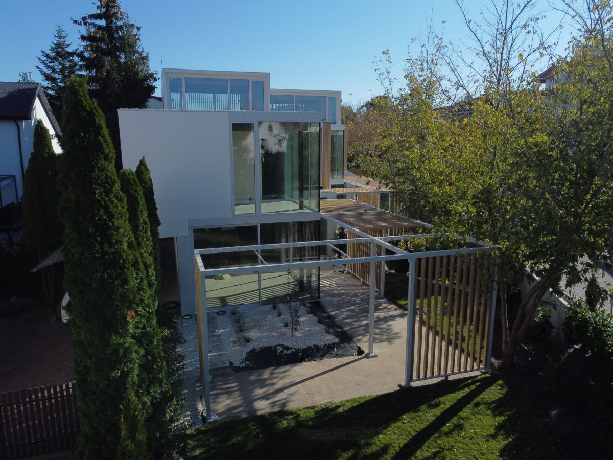 Contemporary, modernist architecture, sparing in the simplicity of forms. Non-standard architectural solutions guaranteeing intimacy and privacy. Glass walls of the house, greenery entering the interiors. Buildings intertwined with each other.