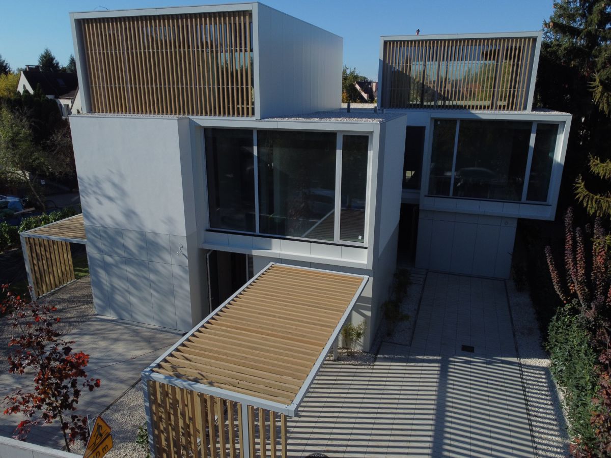 Budynek: elewacja budynku z płyt HP i drewnianych lamele fasadowe