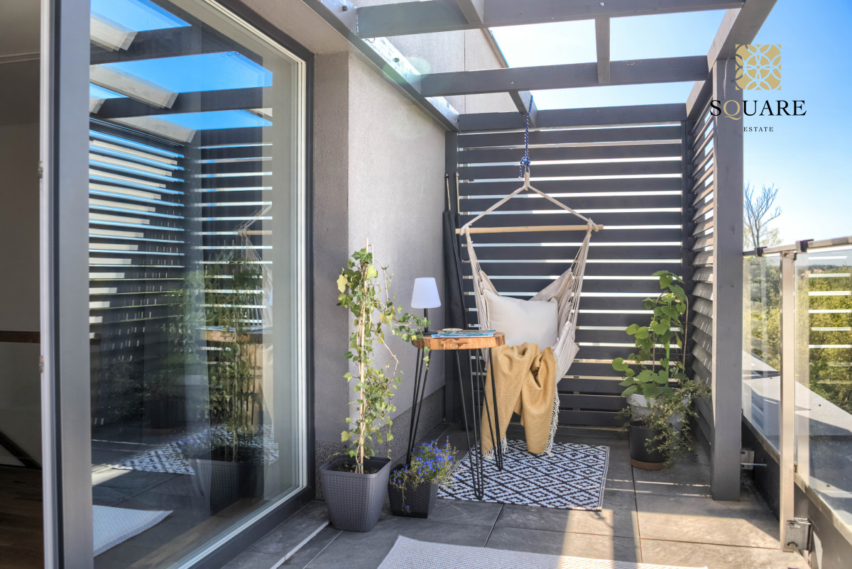 • Taras 17 m² z drewnianą konstrukcją i ruchomymi żaluzjami - idealny do relaksu