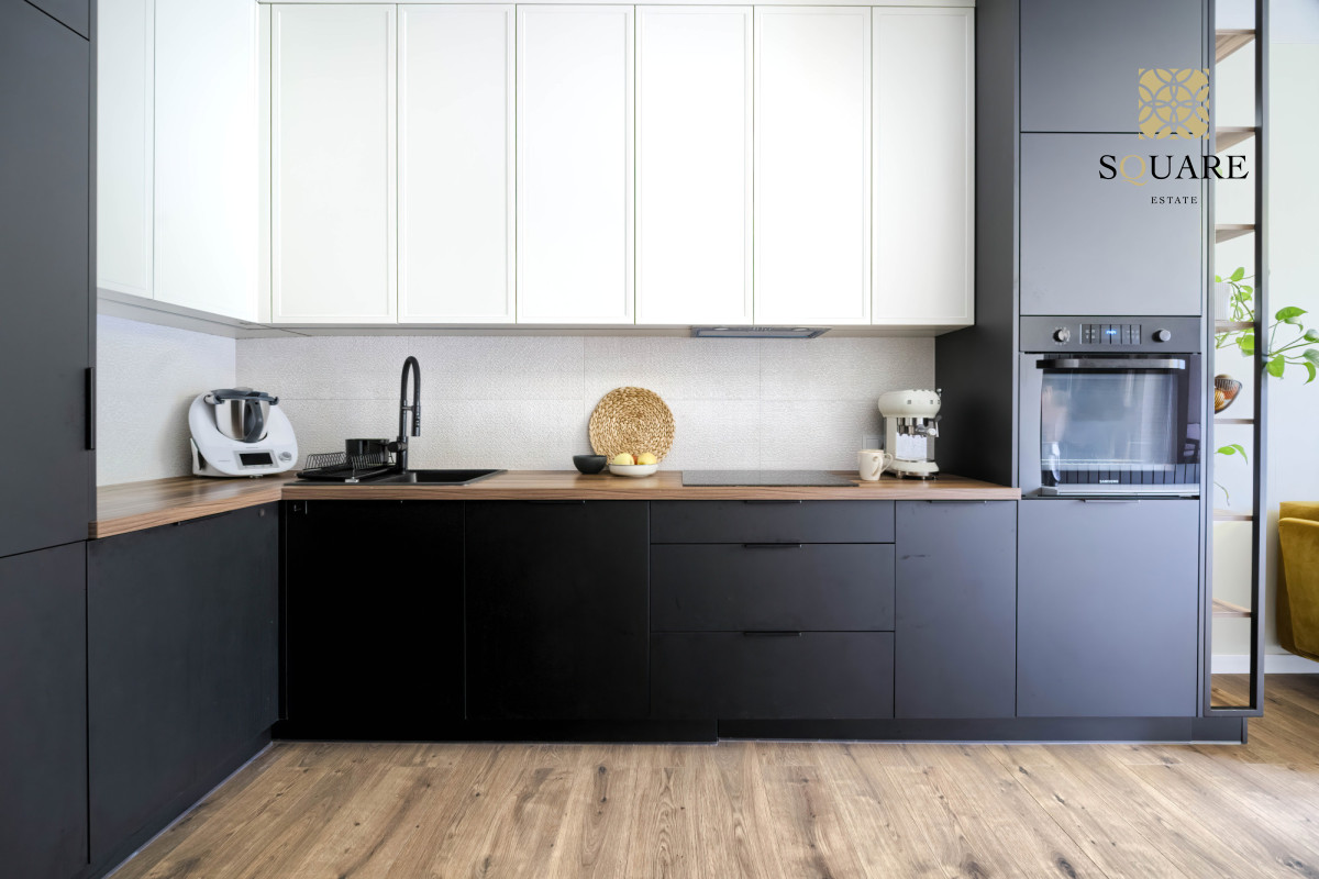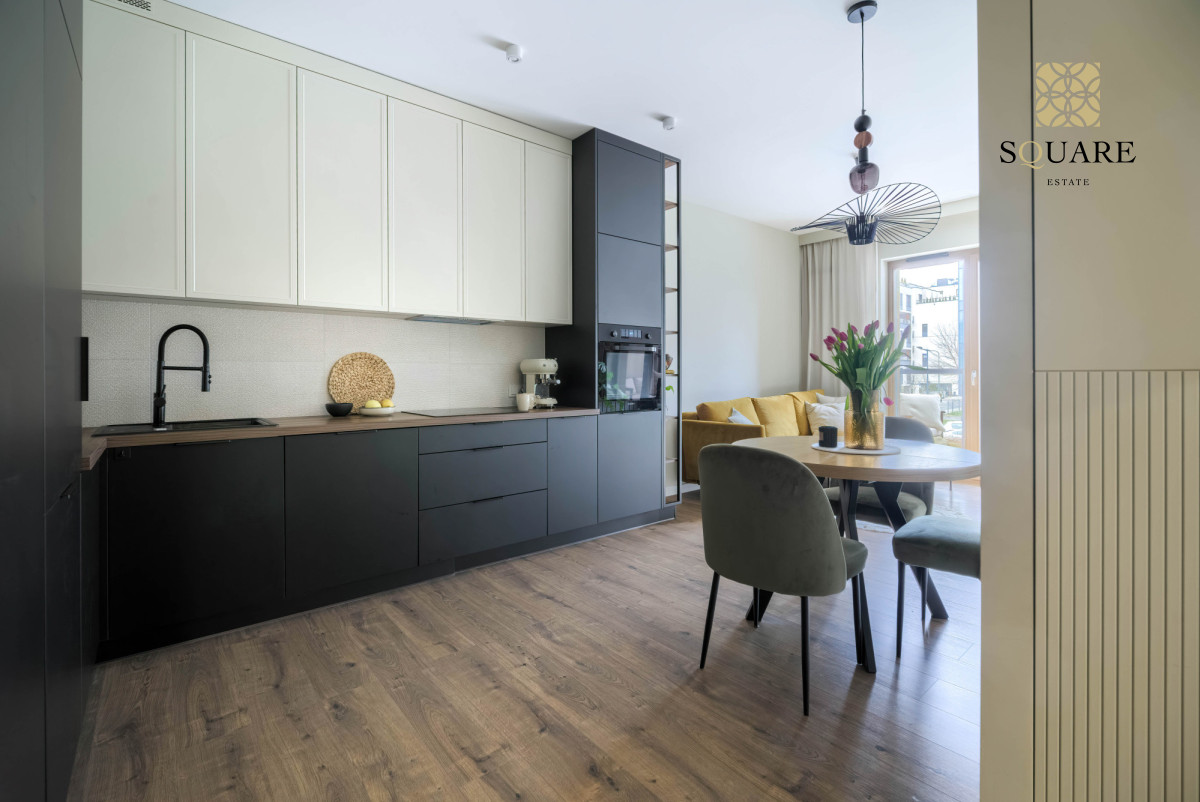 Mieszkanie zaprojektowane przez architekta i wykonane z wysokiej jakości materiałów: lakierowane fronty meblowe, sprzęt AGD marki Blum, duża przestrzeń robocza w kuchni. Wnętrza utrzymane w stonowanej, przyjaznej kolorystyce.