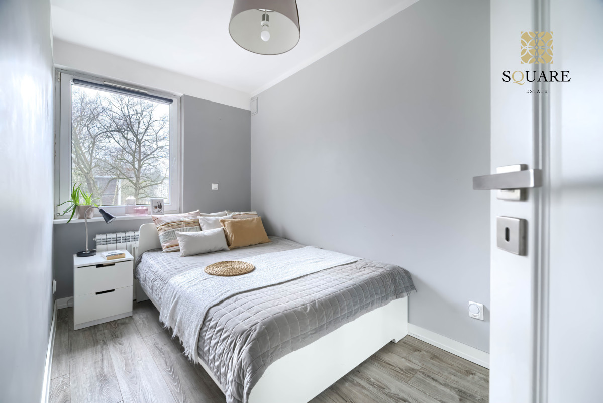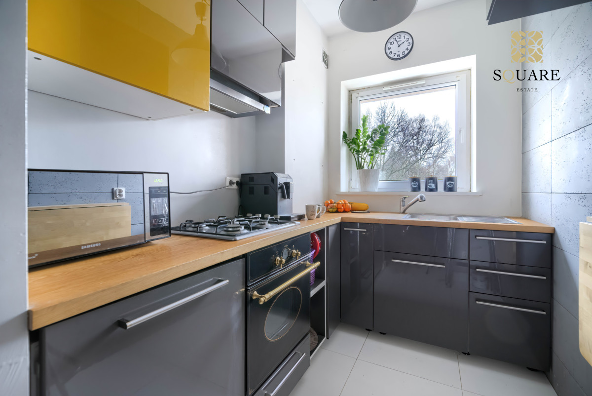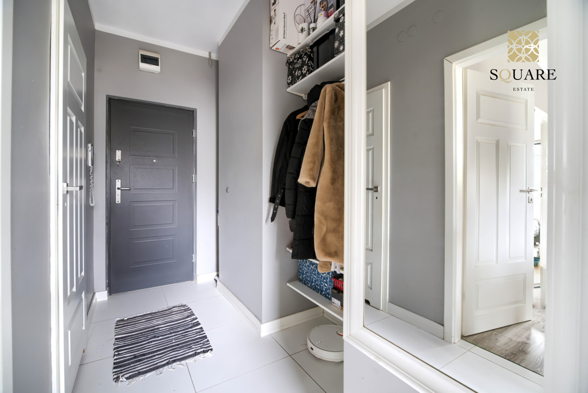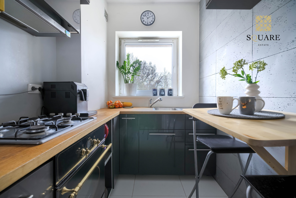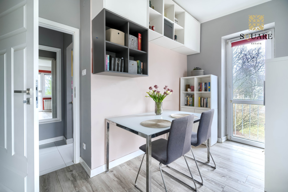 Dużym atutem mieszkania jest oddzielna, jasna i w pełni urządzona kuchnia. Mieszkanie jest zadbane i gotowe do wprowadzenia. Jeśli chodzi o strony świata to nieruchomość usytuowana jest od strony zachodnio-północnej, dlatego też salon posiada dwa okna, jedno od strony zachodniej, a drugie z wyjściem na balkon od strony północnej. Dużym atutem mieszkania jest podłużny balkon z widokiem na zieleń, naktórym swobodnie zmieści np. rower.