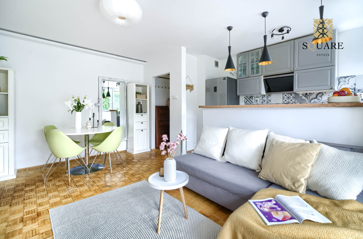 Stary Żoliborz, ul. Promyka 5, between Kępa Potocka and Żeromski Park | apartment 46.91 m² | 3 rooms + open-plan kitchen + bathroom + 2 balconies | move-in ready | 1st floor | elevator | green views on both sides | parking space and basement storage