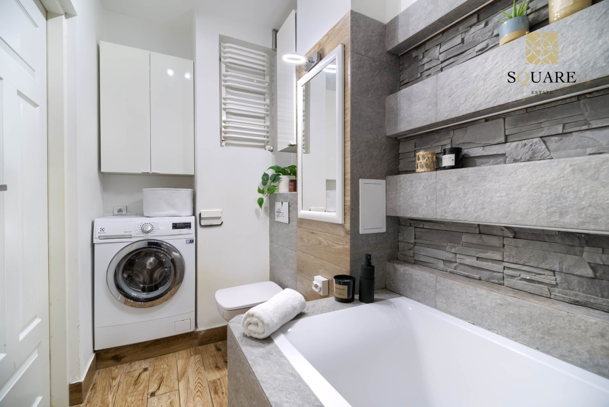 Excellent location near Plac Wilsona metro station, trams, buses, and bicycle paths. Quick access to Trasa Łazienkowska makes it easy to move around Warsaw and leave the city by car.