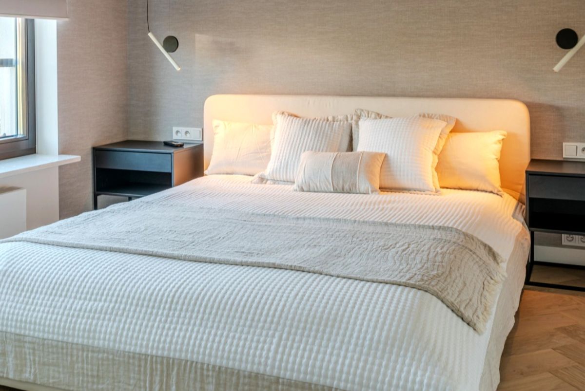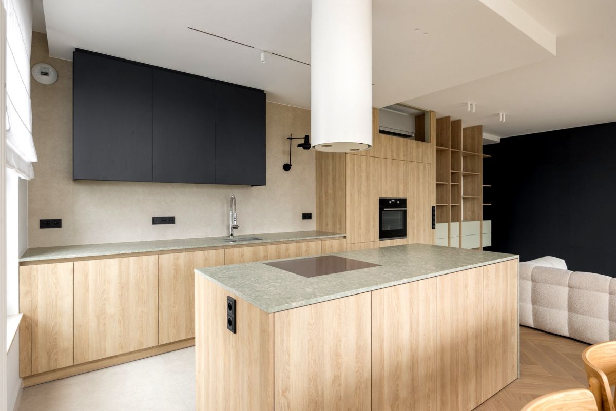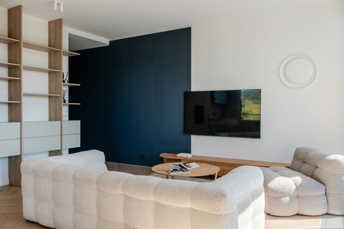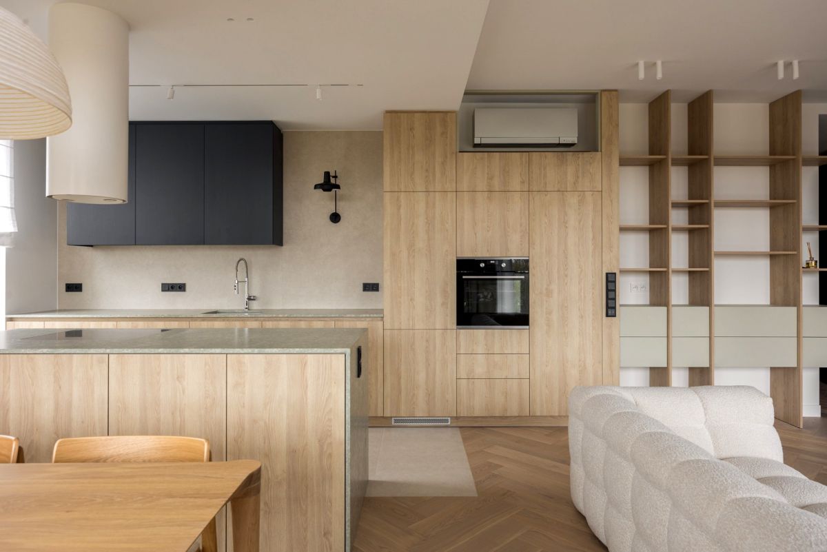 Apartament został wykończony w stylu Scandi Modern i wyposażony został w sprzęty AGD i RTV wysokiej jakości. W zabudowie kuchennej do dyspozycji najemcy jest piekarnik z funkcją mikrofali, w salonie pojawił się telewizor i szafka TV. Dla podniesienia komfortu cieplnego w salonie (ekspozycja zachodnia) zainstalowano klimatyzację, jak również w innych pokojach.