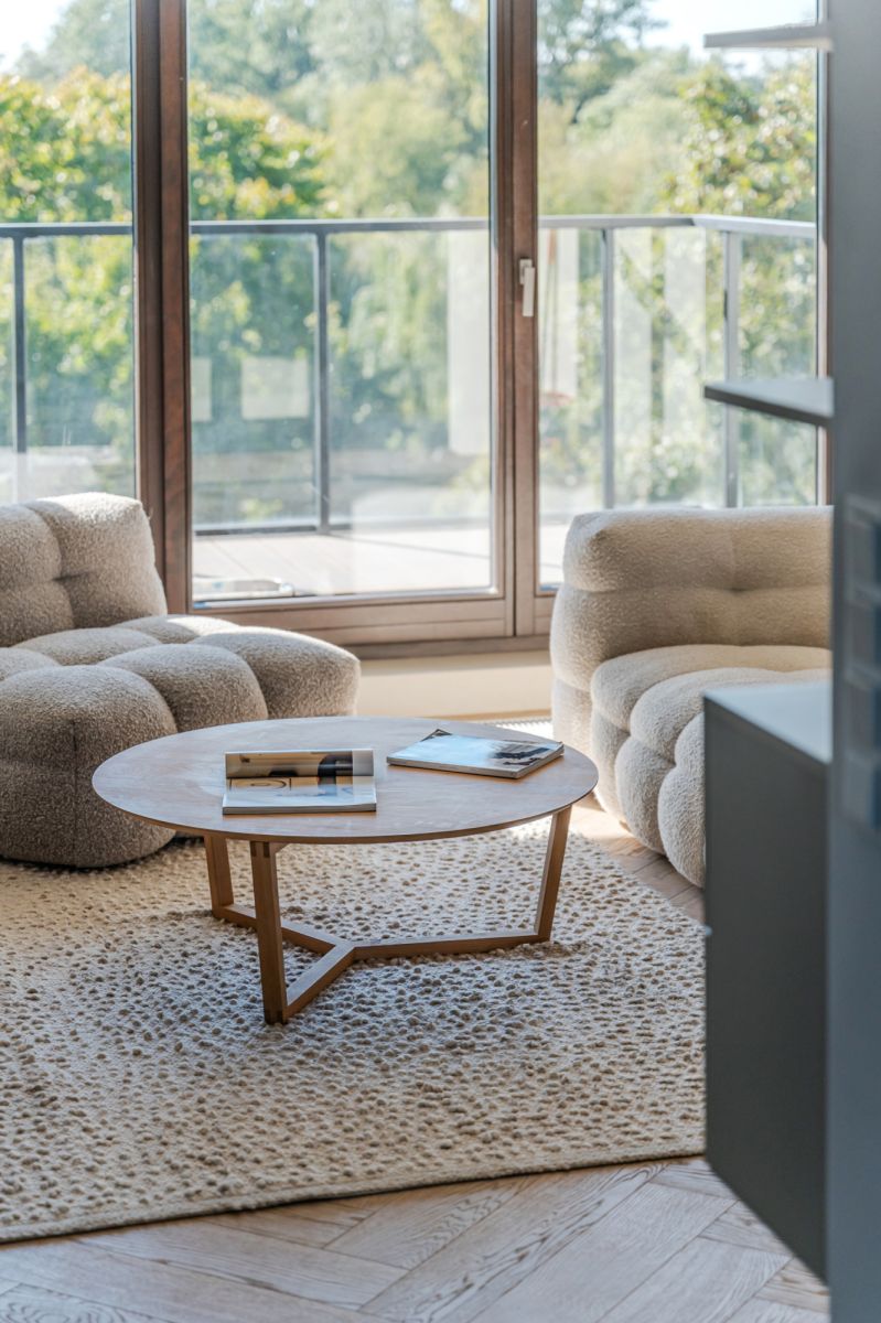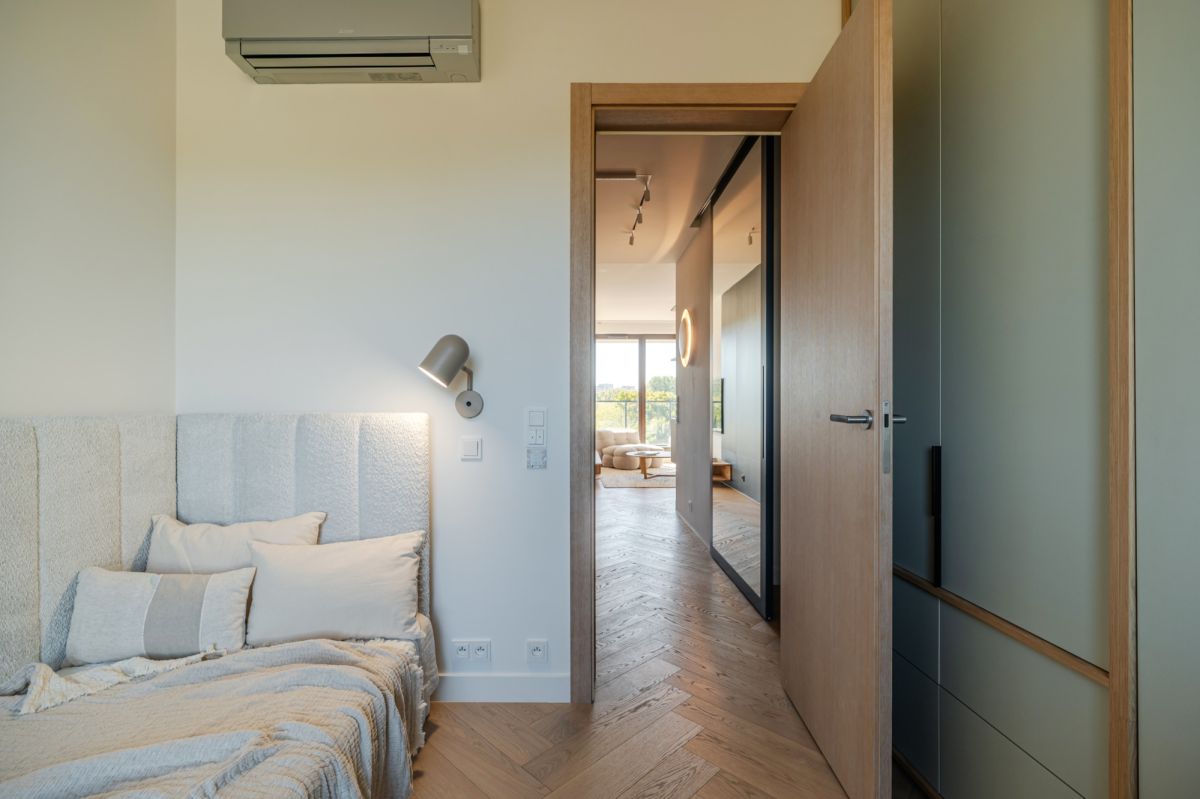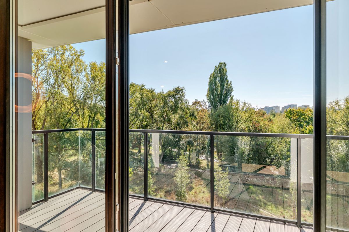 Część dzienna z tarasem i widokiem na Park Skaryszewski | Dwie sypialnie | Gabinet| Dwa miejsca parkingowe w garażu podziemnym | Klimatyzacja | Scandi Modern