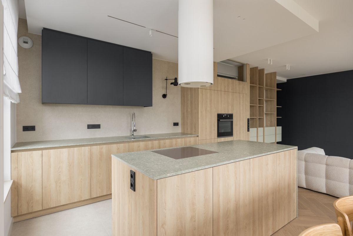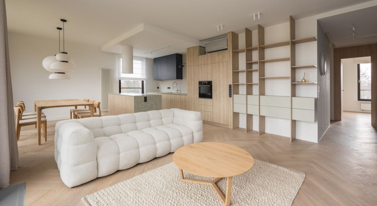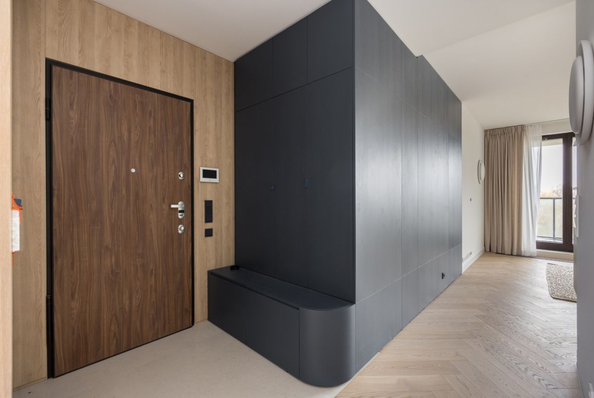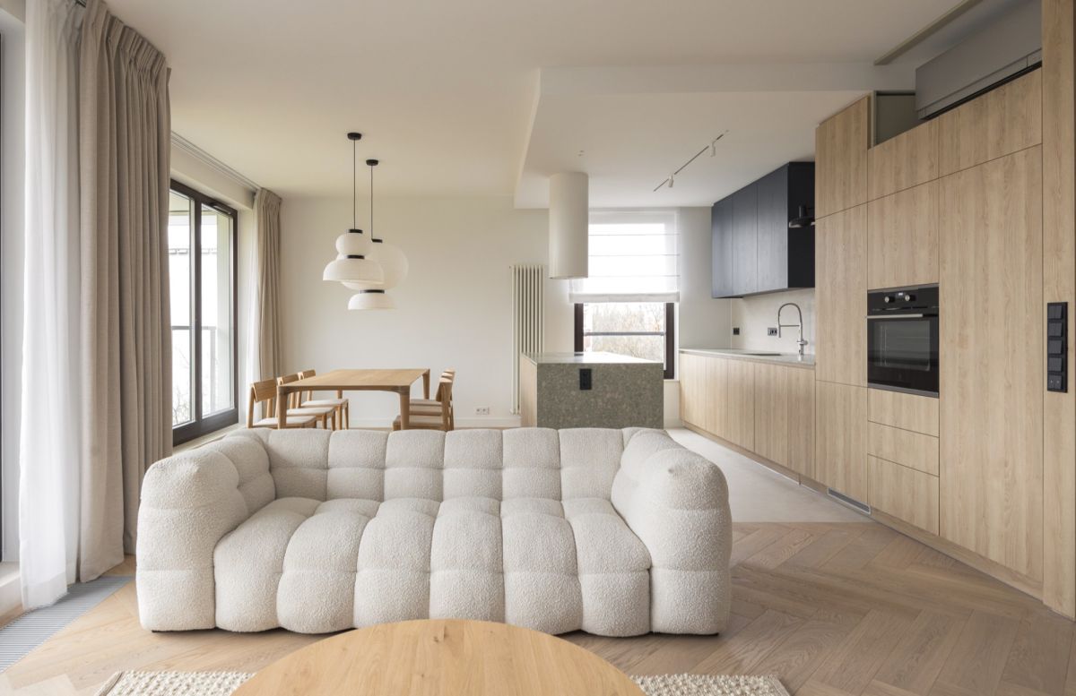 Apartament został wykończony w stylu Scandi Modern i wyposażony został w sprzęty AGD i RTV wysokiej jakości. W zabudowie kuchennej do dyspozycji najemcy jest piekarnik z funkcją mikrofali, w salonie pojawił się telewizor i szafka TV. Dla podniesienia komfortu cieplnego w salonie (ekspozycja zachodnia) zainstalowano klimatyzację, jak również w innych pokojach.