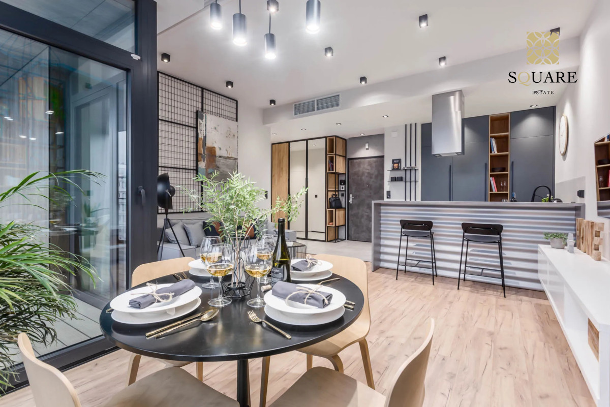 * otwartej kuchni wyposażonej w niezbędne sprzęty AGD, strefę jadalną, z okrągłym stołem i 4 krzesłami oraz z wyspy kuchennej z 2 krzesłami.