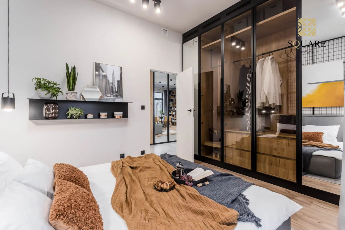 * sypialni z dużym łóżkiem i obszerną szafą,